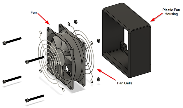 I designed two separate assemblies that would be connected only electrically; one was the fan assembly and the other housed my custom PCB, TUI, and all other circuitry.